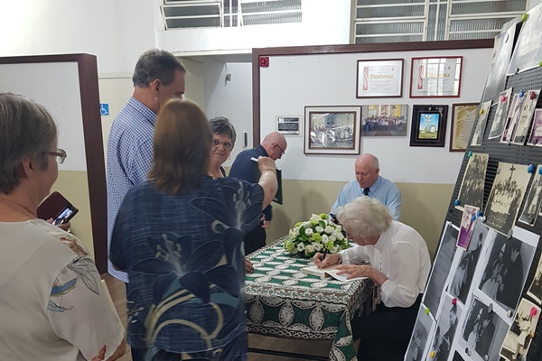 Estiveram presentes, representando o pastor Leopoldo Heimann (in memorian), sua esposa Maria Luíza Heimann e também o filho, Rev. Thomás Heimann, que saudaram a todos os presentes e ainda puderam autografar o livro “Segue-me”, de autoria do Rev. Leopoldo, o qual foi presenteado a cada um dos confirmandos de 1969.