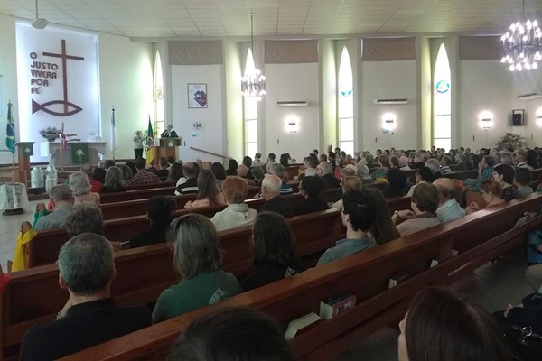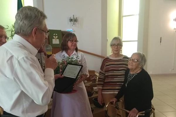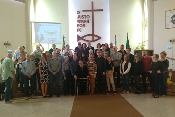 Dentro do culto também aconteceu a homenagem a senhora mais idosa da congregação, Clotildes Thomé Merker, que, no último dia 10 de setembro de 2019, comemorou 100 anos de idade. Foi um momento emocionante ver toda a congregação cantando o parabéns gaúcho para esta senhora centenária: “Parabéns, Parabéns, saúde, felicidade; que tu colhas sempre todo o dia paz e alegria na lavoura da amizade.”