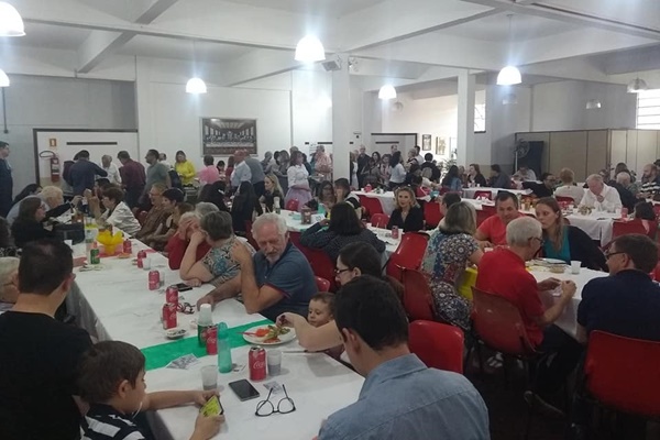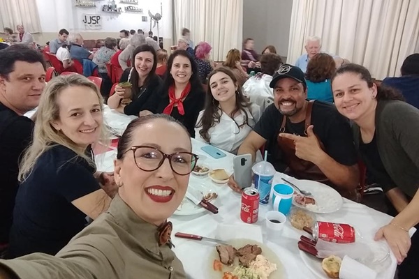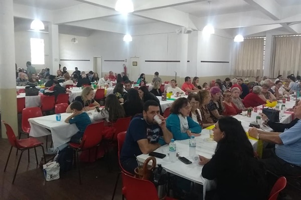Ao meio dia, com o grupo Trava de Porteira no comando da churrasqueira e membros da diretoria e departamento de Servas nas saladas e sobremesas, cerca de 200 pessoas almoçaram no salão da igreja. Estava tudo ótimo. Parabéns aos decoradores, cozinheiros e assadores.