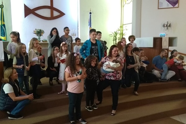 No final de cada culto, as mães presentes foram chamadas para perto do altar, onde receberam a bênção de Deus e foram homenageadas pelas crianças da Escola Dominical.
